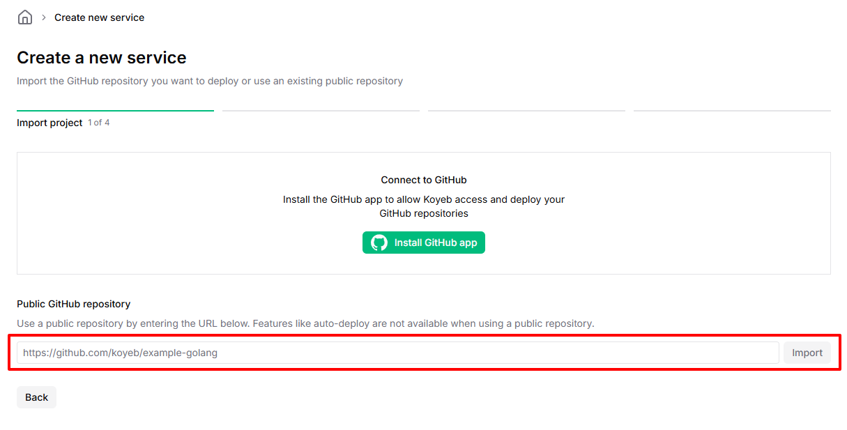 Public Github repositoryで先ほどプッシュしたリポジトリのURLを入力し、importをクリックします。