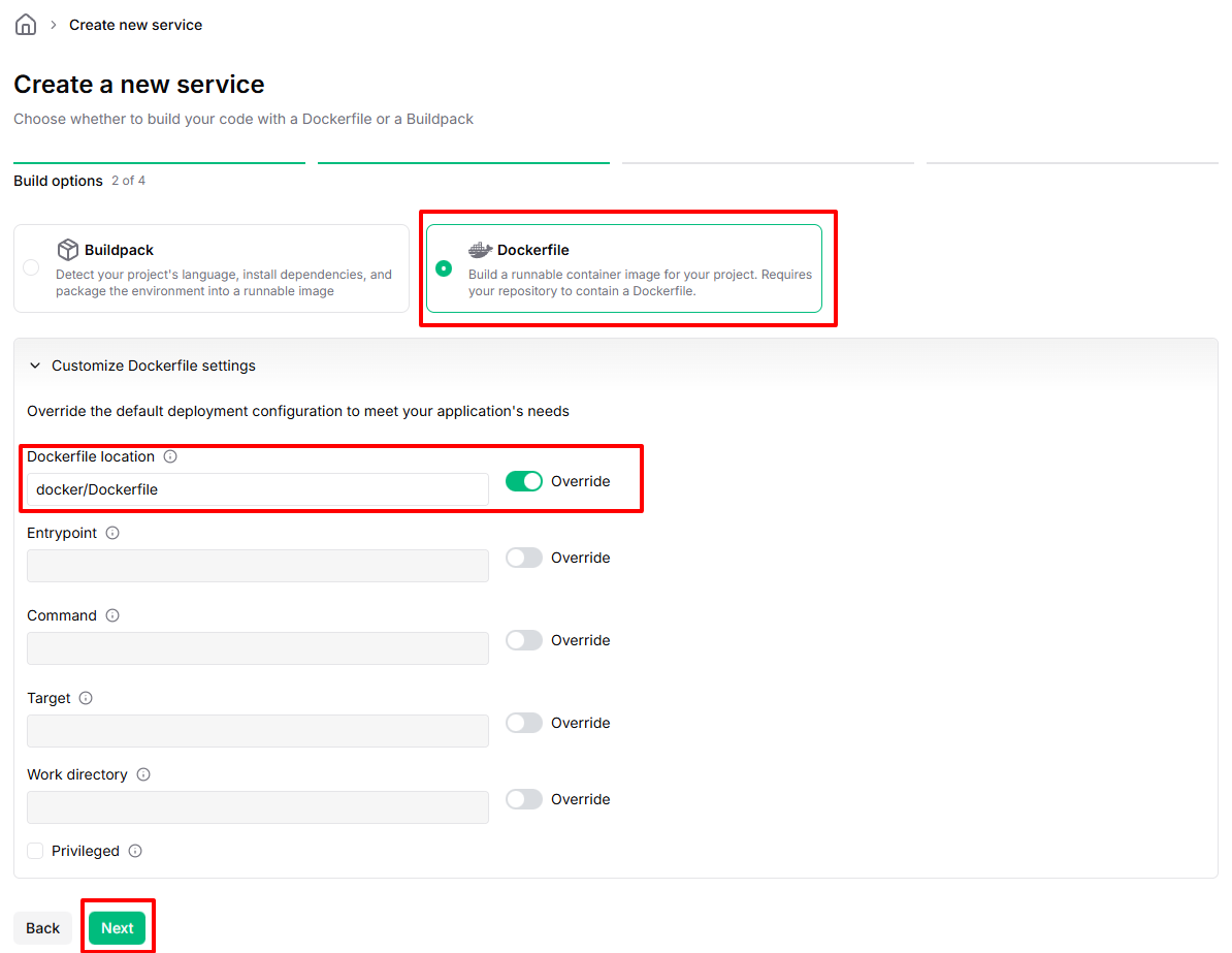 Dockerfileを選択し、Customize Dockerfile settingsからDockerfileの場所を選択します(Dockerfileをプロジェクトのルートディレクトリに配置している場合、この作業は不要です)