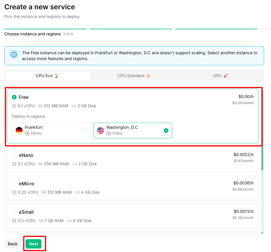 CPU EcoのFreeインスタンスを選択し、Nextをクリックします。