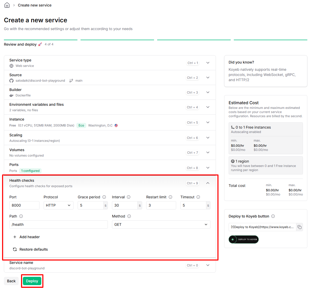 ヘルスチェックの情報を入力し、Deployをクリックします。