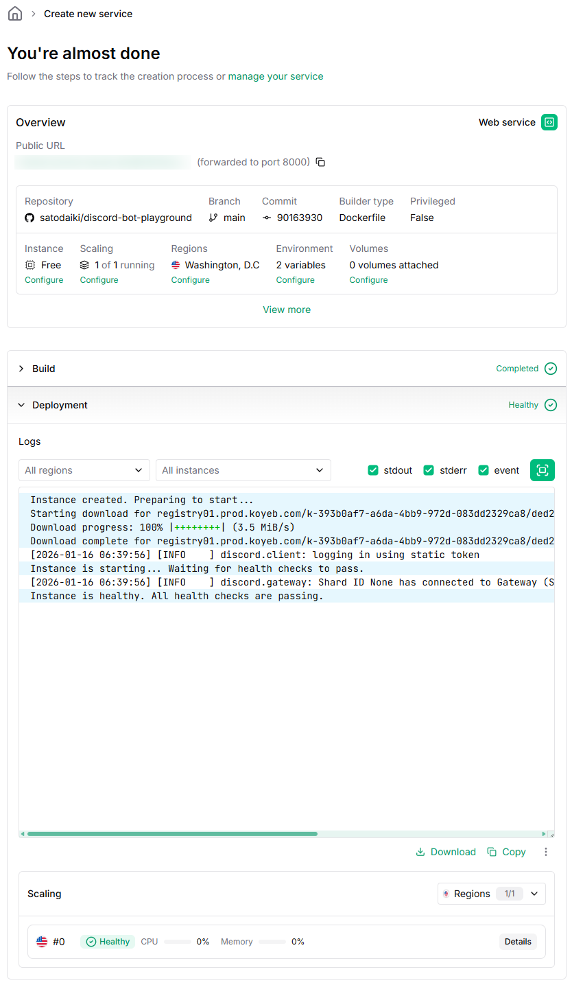 Koyebに公開するにあたり、ヘルスチェックエンドポイントが必要だということが分かりました。