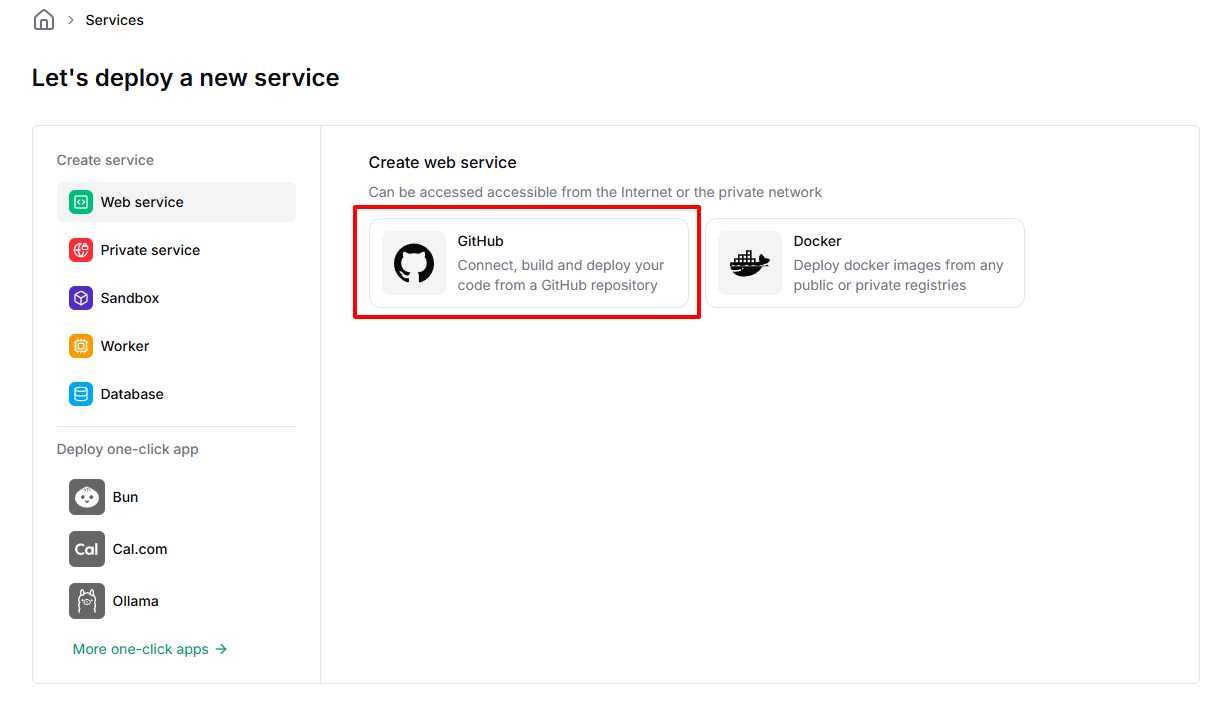 koyebのWebコンソールを開き、「Web Service」を選択して「Github」を選択します。