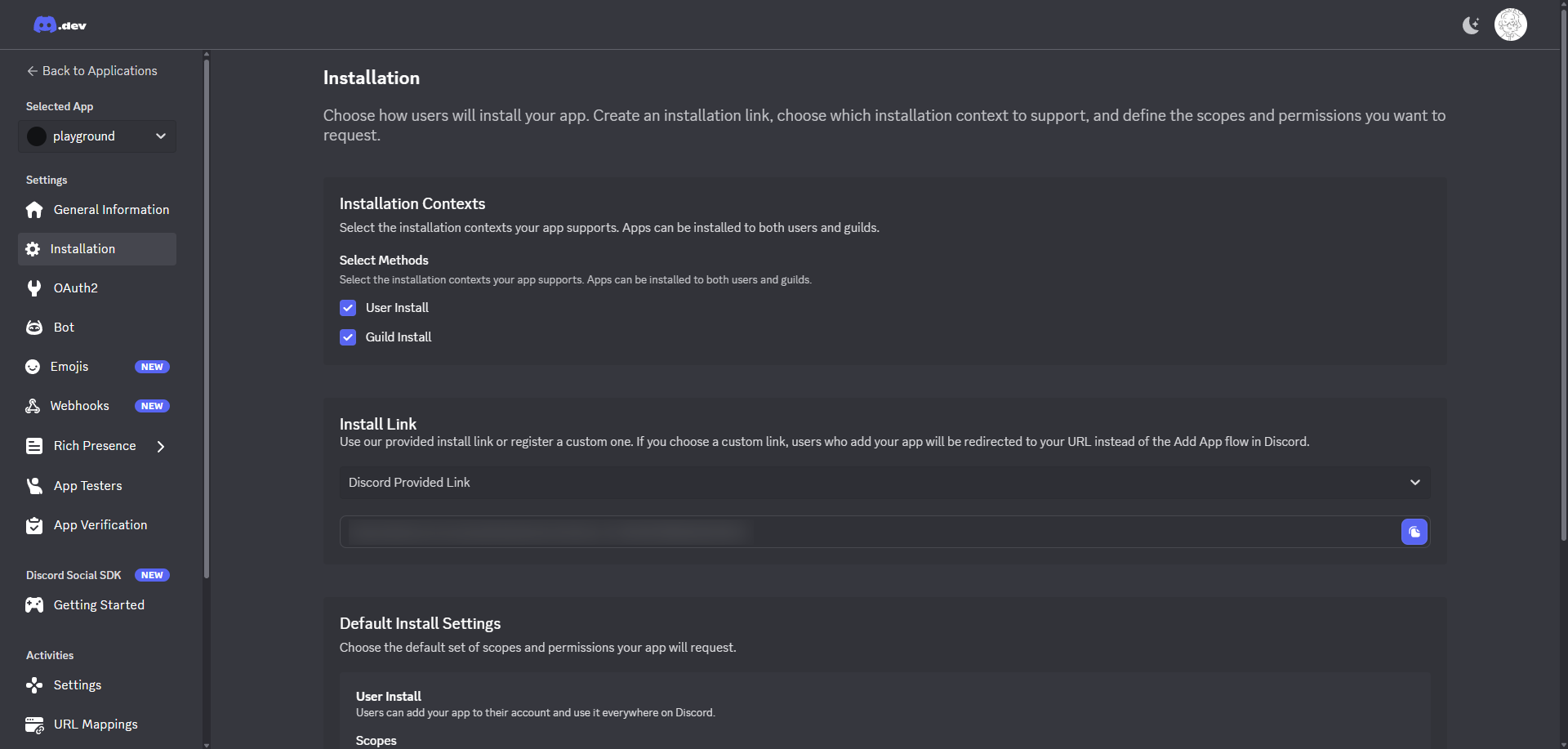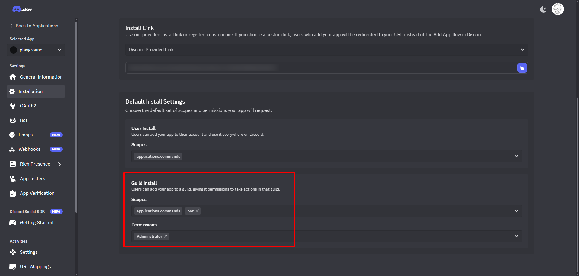InstallationタブからGuild InstallのScopesにbotを追加し、権限を設定します。(ここ重要)