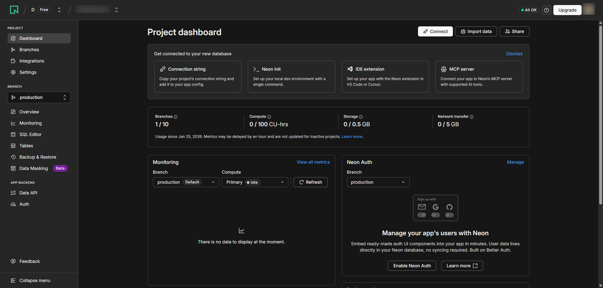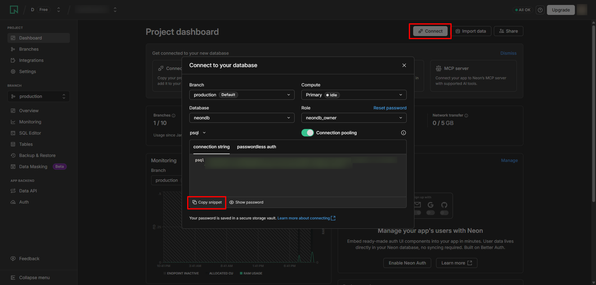 NeonのプロジェクトダッシュボードからConnectをクリックし、表示されたconnection stringをコピーします。