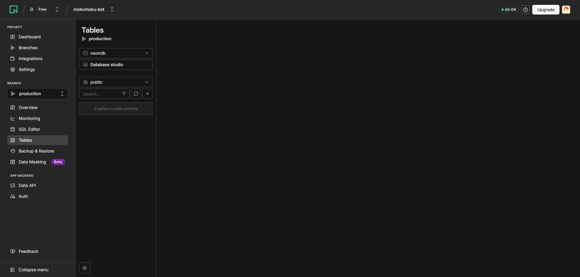 neondbというDBがあるのと、publicスキーマがあるだけで、テーブルは何もありません。