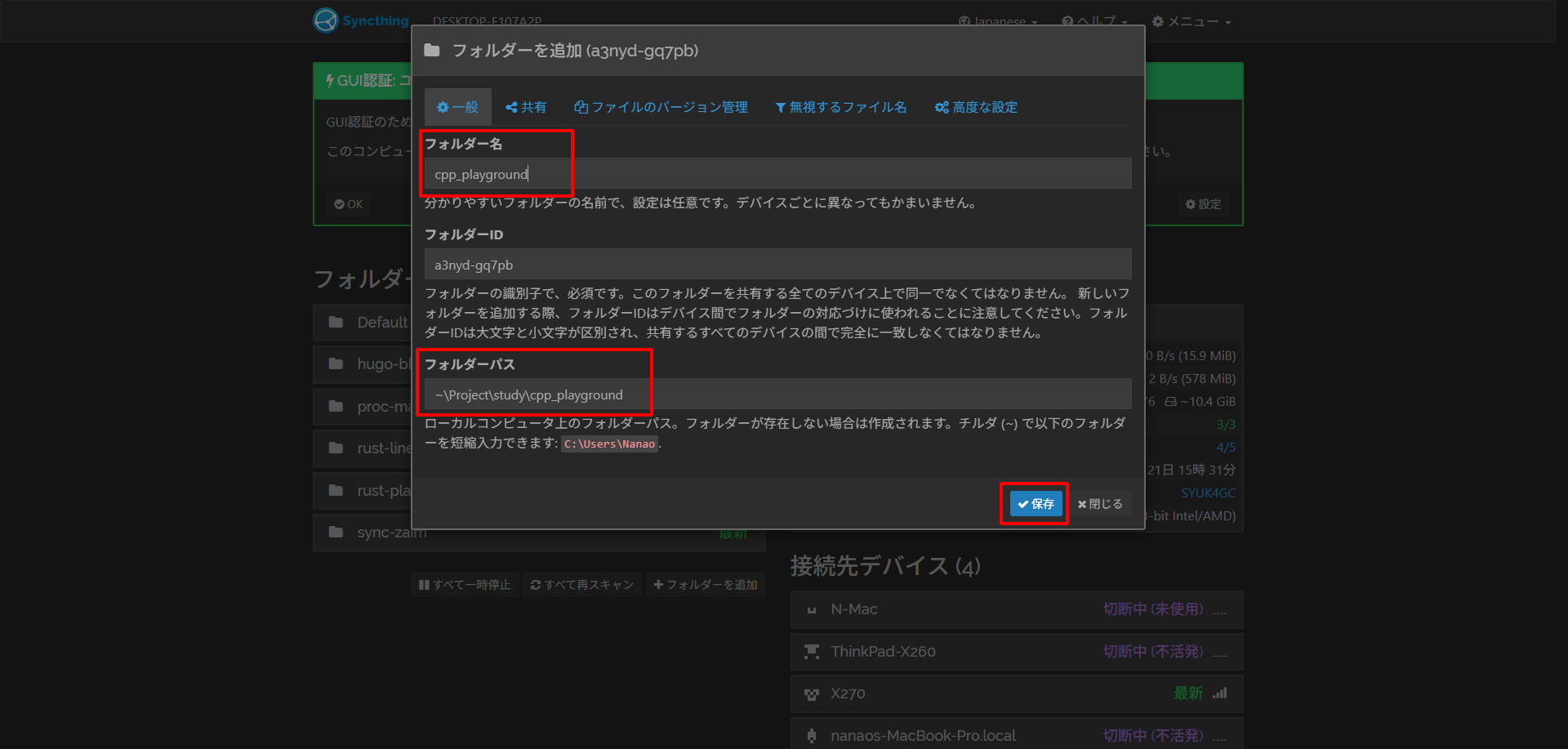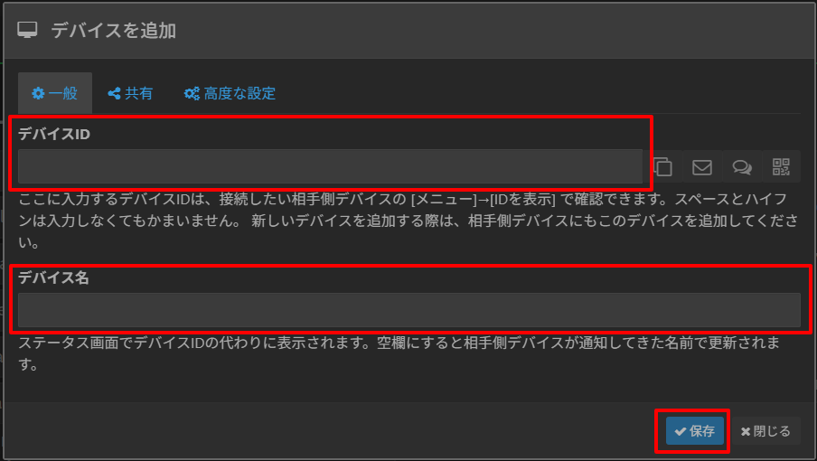画像では何も入力されていませんが、同一ネットワークに未登録かつSyncthing起動済みのデバイスがある場合IDが自動入力されます。
