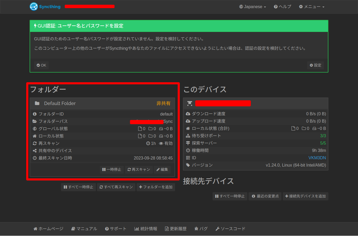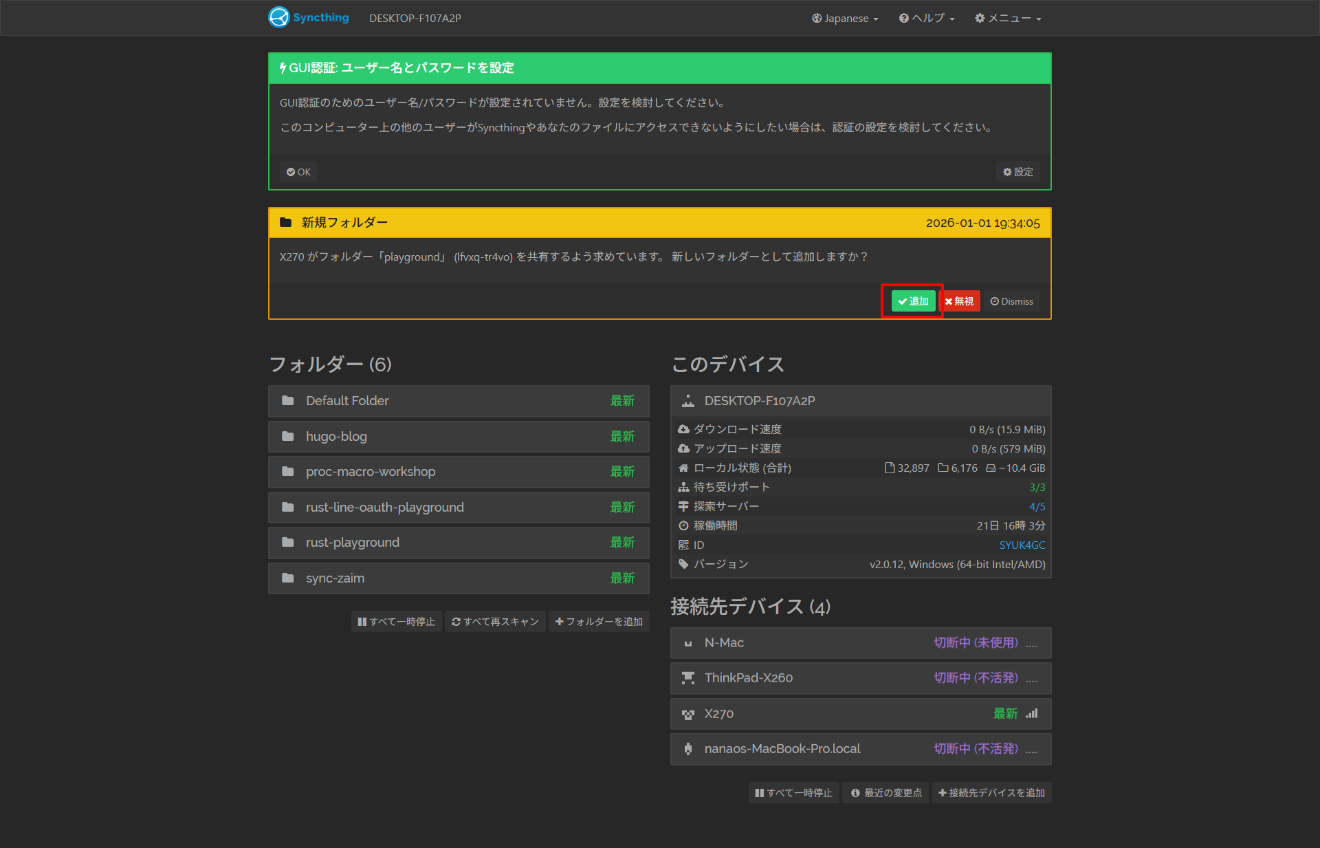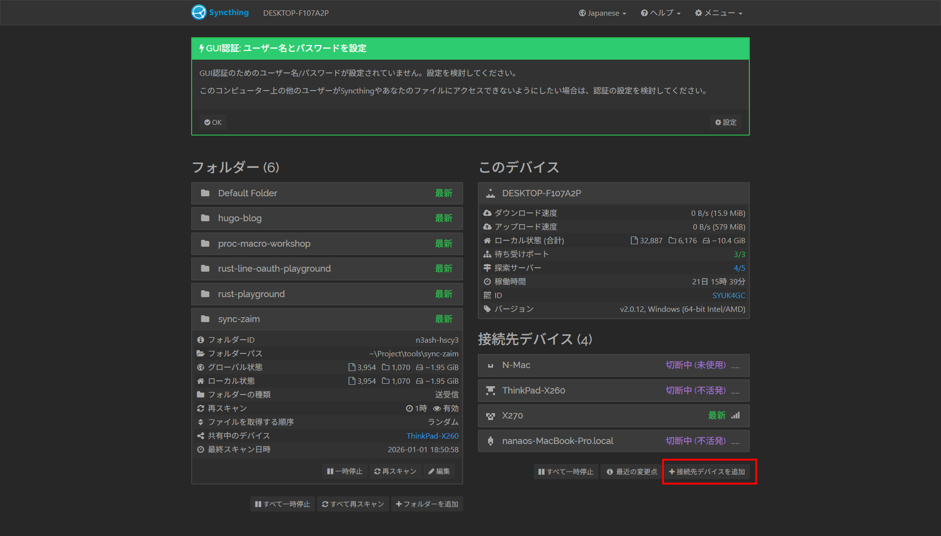 Syncthingをセットアップしたデバイスがローカルネットワーク上に二台以上できたなら、フォルダ共有の準備が整いました。