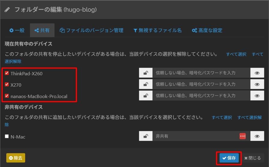 共有タブから共有したいデバイスにチェックを入れ、保存を押します。