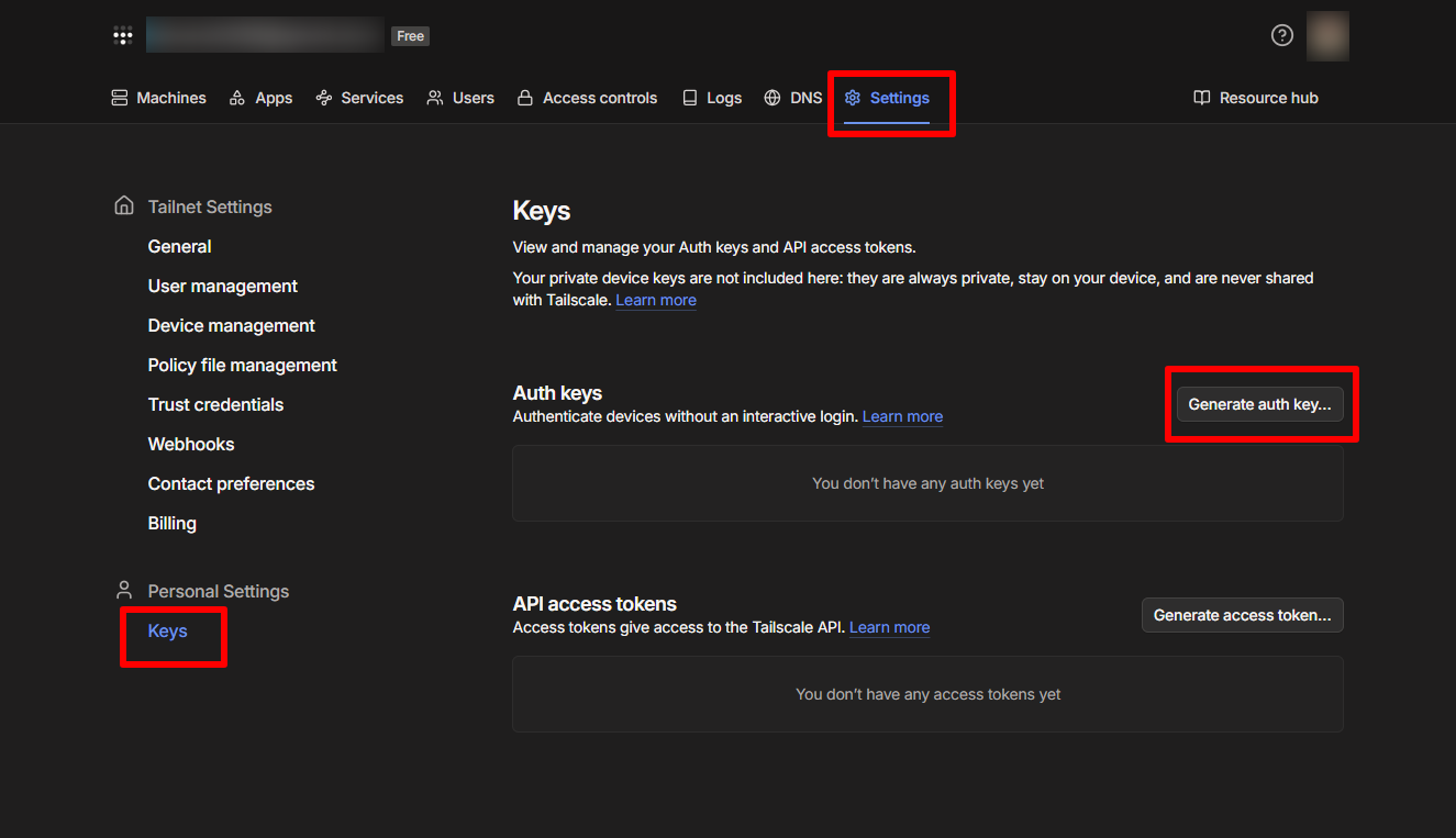 SettingsタブのKeysから、Generate auth key…をクリックします。