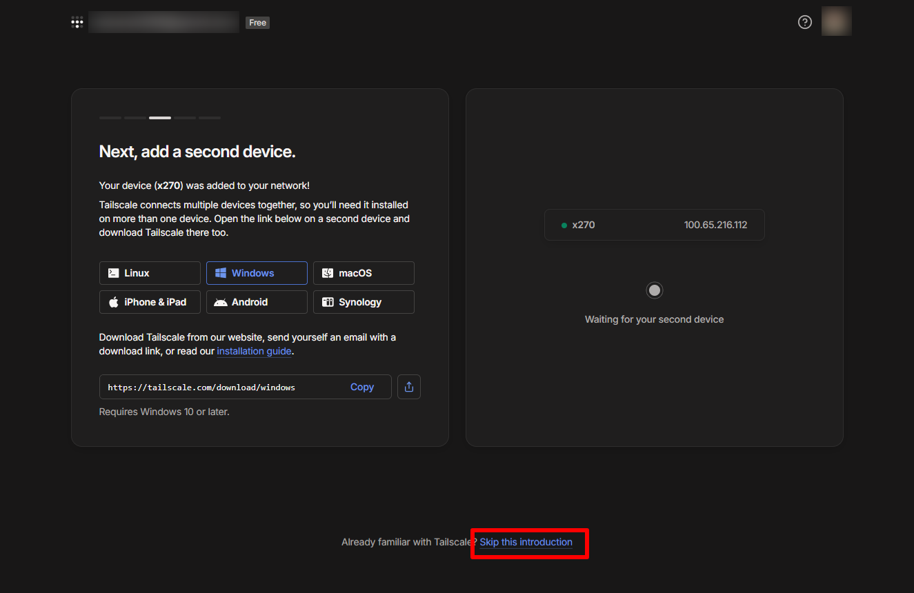 先ほどの画面からadmin consoleに移動して、以下の「Skip this introduction」をクリックします。
