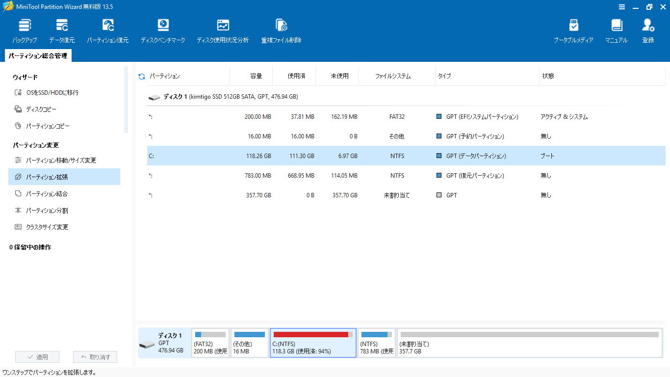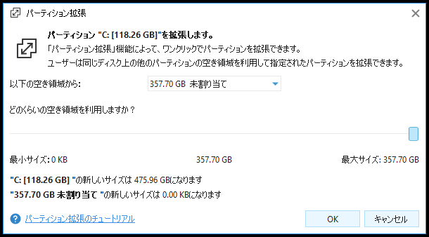 未割当領域を限界までCドライブに拡張するように設定し、OKを押します。